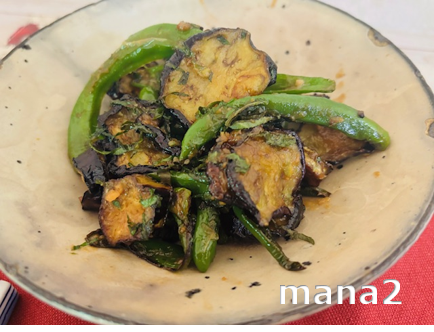 万願寺とうがらし、シソと一緒に味噌炒めに。