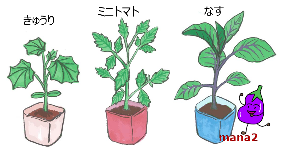 ある日、他の野菜苗と一緒に、ナスの苗を2株持って登場しました。