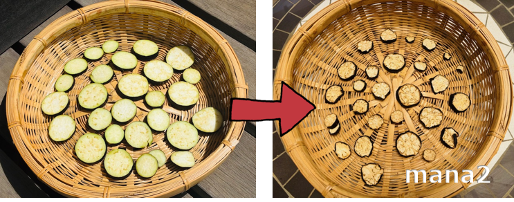 冷凍という手もありますが、今回は夏の日差しを活用して「干しナス」にトライ。