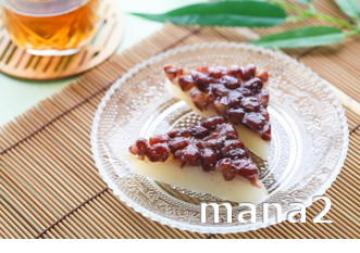 三角形の「ういろう」生地の上にふっくらと煮た小豆という組み合わせで、もっちり食感のやさしい味です。